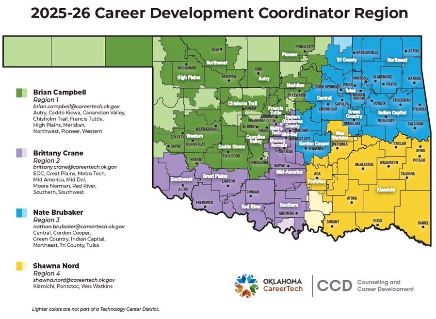 Regional Career Development Coordinators serve as liaisons to technology centers and comprehensive schools, conducting visits and maintaining regular communication with these partners. They also collaborate with internal and external entities to explore partnership opportunities that support the CTE system within their assigned region.