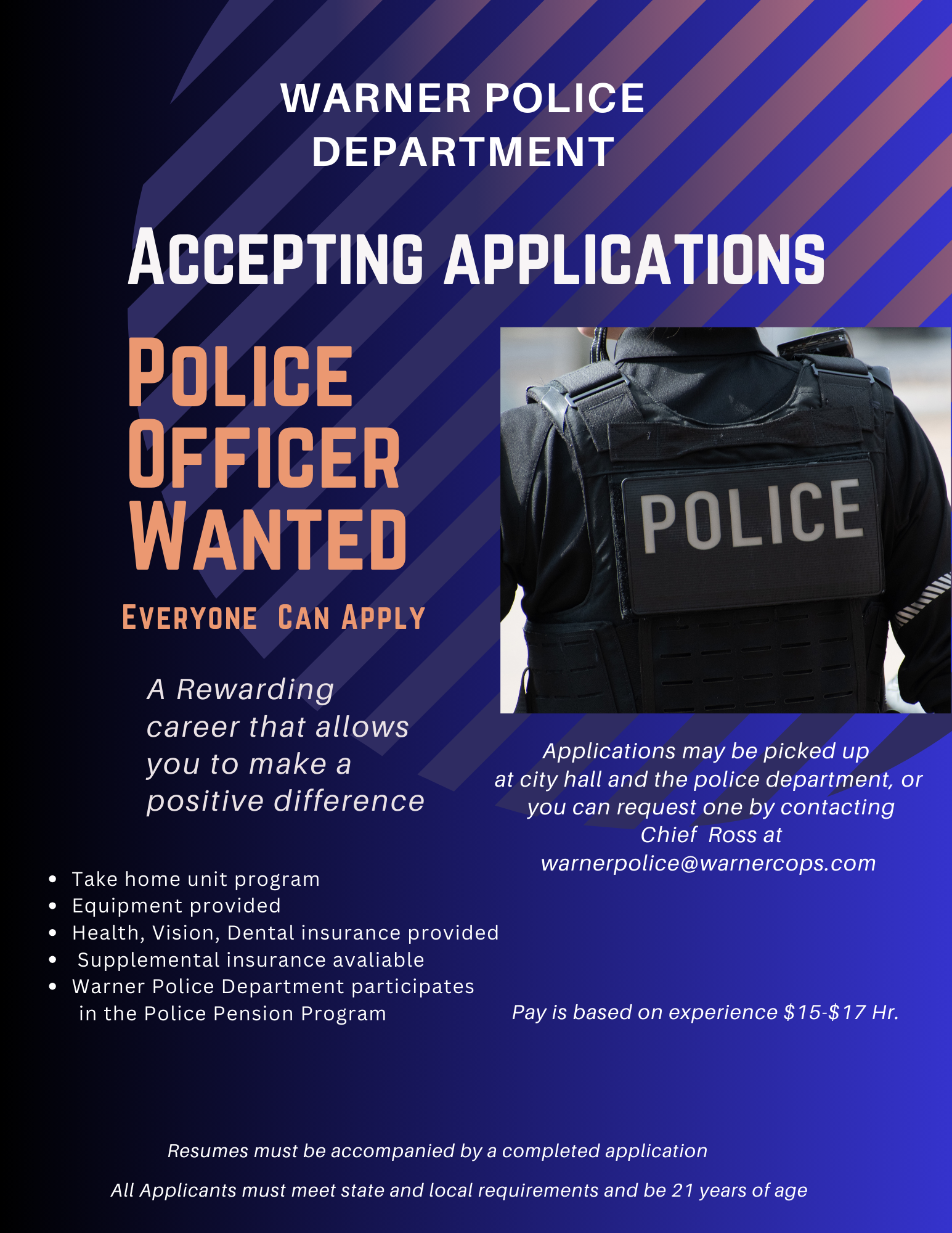 The Town of Dibble Police Department is currently accepting applications for the following positions.