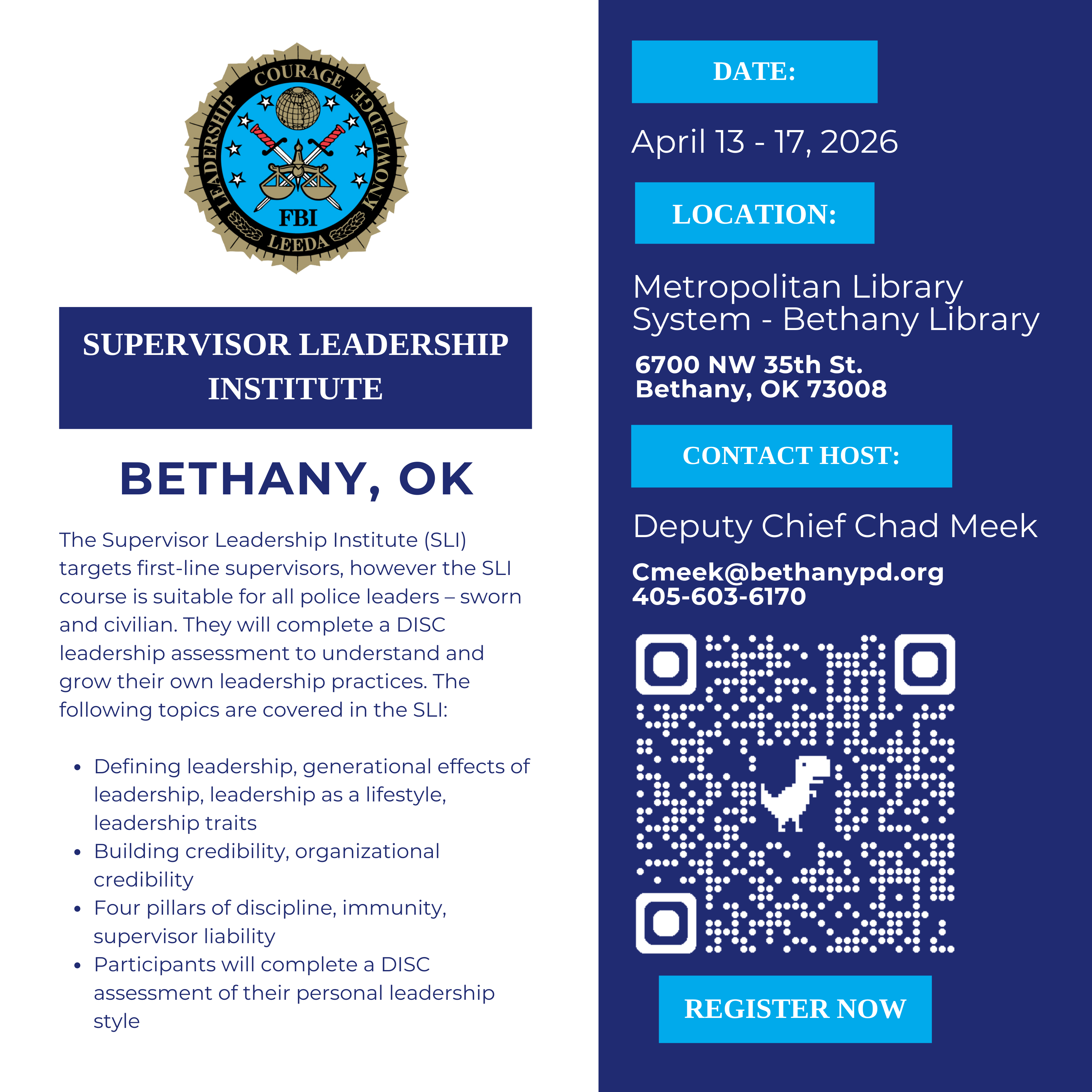 The Supervisor Leadership Institute (SLI) targets first-line supervisors, however the SLI course is suitable for all police leaders - sworn and civilian. They will complete a DISC leadership assessment to understand and grow their own leadership practices. The following topics are covered in the SLI: Defining leadership, generational effects of leadership, leadership as a lifestyle, leadership traits; Building credibility, organizational credibility; Four pillars of discipline, immunity, supervisor liability; Participants will complete a DISC assessment of their personal leadership style.