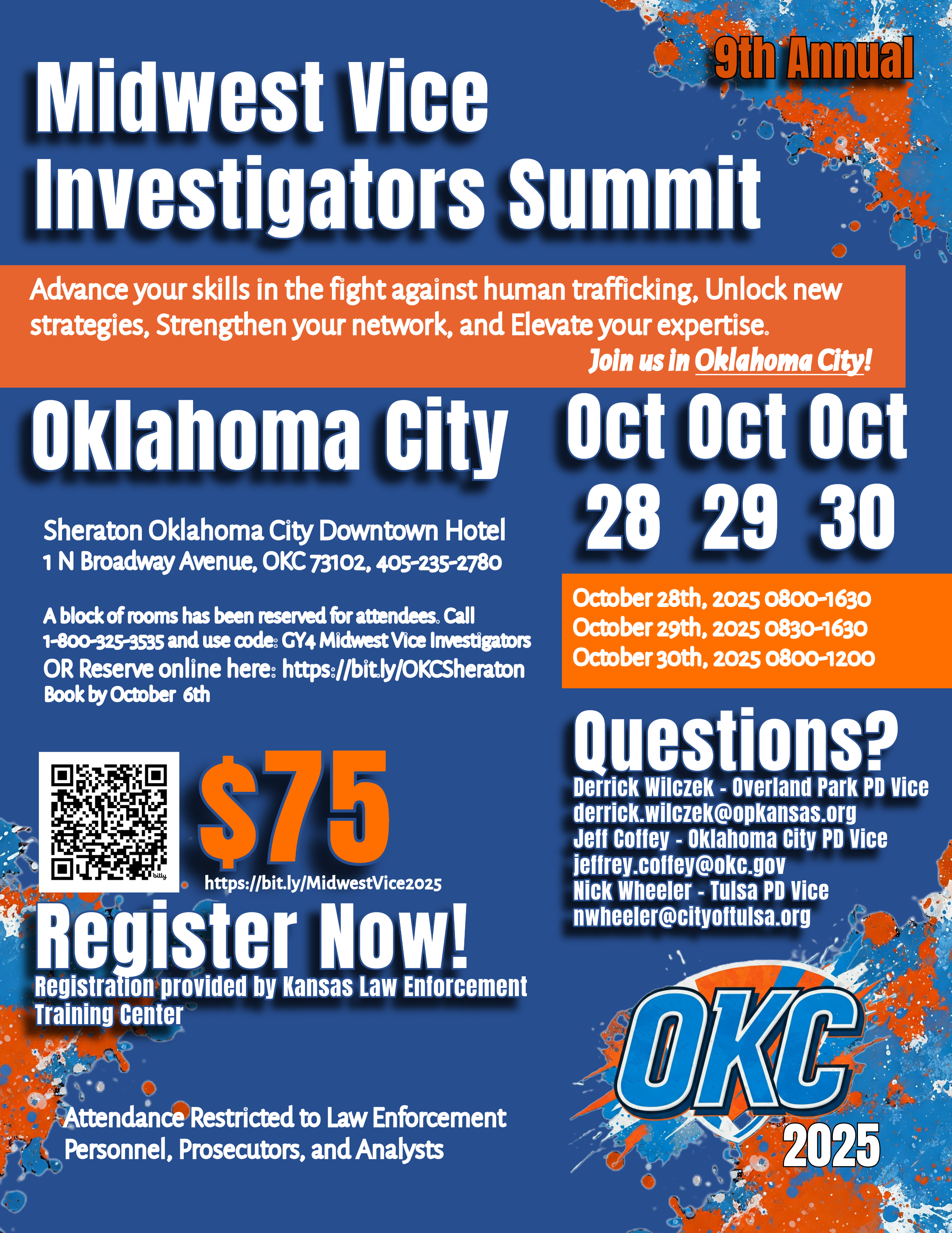 The Midwest Vice Investigators Summit is a 2.5 day practitioner-led training event designed to arm new and experienced VICE and Human Trafficking investigators with the cutting-edge tradecraft and skill sets required to successfully navigate both simple and complex cases. Training Topics include HT basics, Commercial Sex Venues, Intervention Opportunities, Interview Strategies, Examples of Corroborative Evidence, and Tools and Techniques for HT Identification. The training times will be filled with case study presentations and best practice examples. The summit is designed to foster the sharing of intelligence, tradecraft, tactics, and trends. Attendees will be presented with great opportunities for relationship-building and networking.