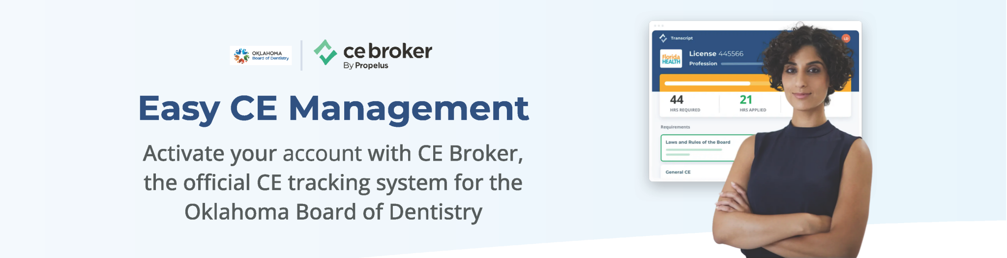 On July 1, 2025, the Board of Dentistry began using CE Broker for all CE entries. To log your hours, go to www.cebroker.com. If you have a specialty only license issued prior to the April 18, 2025, Board Meeting, you were sent an email with your CE Broker number.