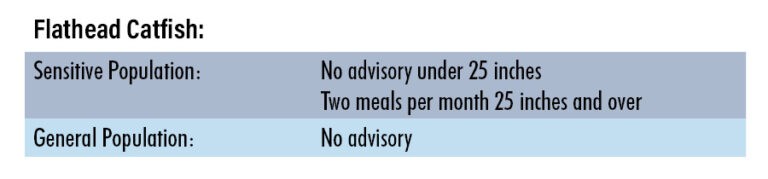 If you are a part of the sensitive population and eating flathead catfish, you can have an unlimited amount of fish if it is less than 25 inches long. If you have a fish that is over 25 inches, you can have two meals for the entire month. Furthermore, you can still have two meals of fish over 25 inches AND unlimited amounts of fish under 25 inches in the same month. If you are a part of the general population, you can eat unlimited amounts of flathead catfish regardless of size.