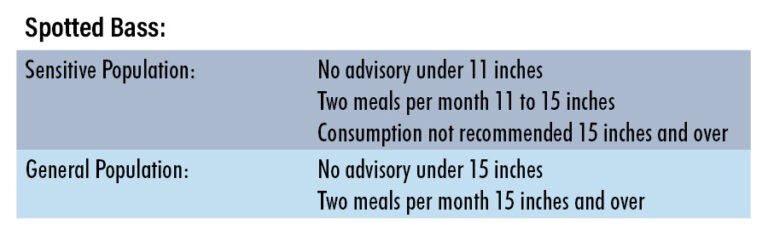 If you are a part of the sensitive population and eating spotted bass, you can have an unlimited amount of fish if it is less than 11 inches long. If you have a fish that is between 11 – 15 inches long, you can have two meals for the entire month but avoid eating fish over 15 inches long. If you are a part of the general population, you can eat unlimited amounts of spotted bass if they are smaller than 15 inches. If you have a fish that is over 15 inches, you can have two meals for the entire month.
