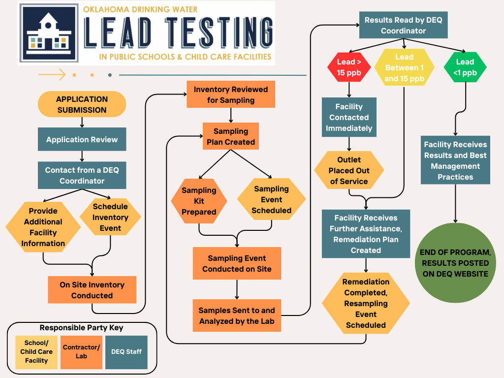 The Oklahoma Lead Testing Program is a free, statewide initiative by DEQ to reduce lead exposure where children are cared for. Public schools and licensed child care facilities are eligible to participate in this program which provides free sampling and laboratory testing to identify lead in drinking water. If lead is found, DEQ can provide funding and guidance to assist with removing lead from a facility’s drinking water.