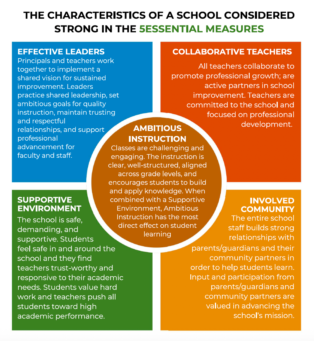 The 5Essentials Framework is based on over 20 years of research from The University of Chicago Consortium on School Research. The Framework outlines the 5Essential factors that research revealed are necessary for driving sustainable school improvement: Effective Leaders, Collaborative Teachers, Ambitious Instruction, Supportive Environment, and Involved Families.
