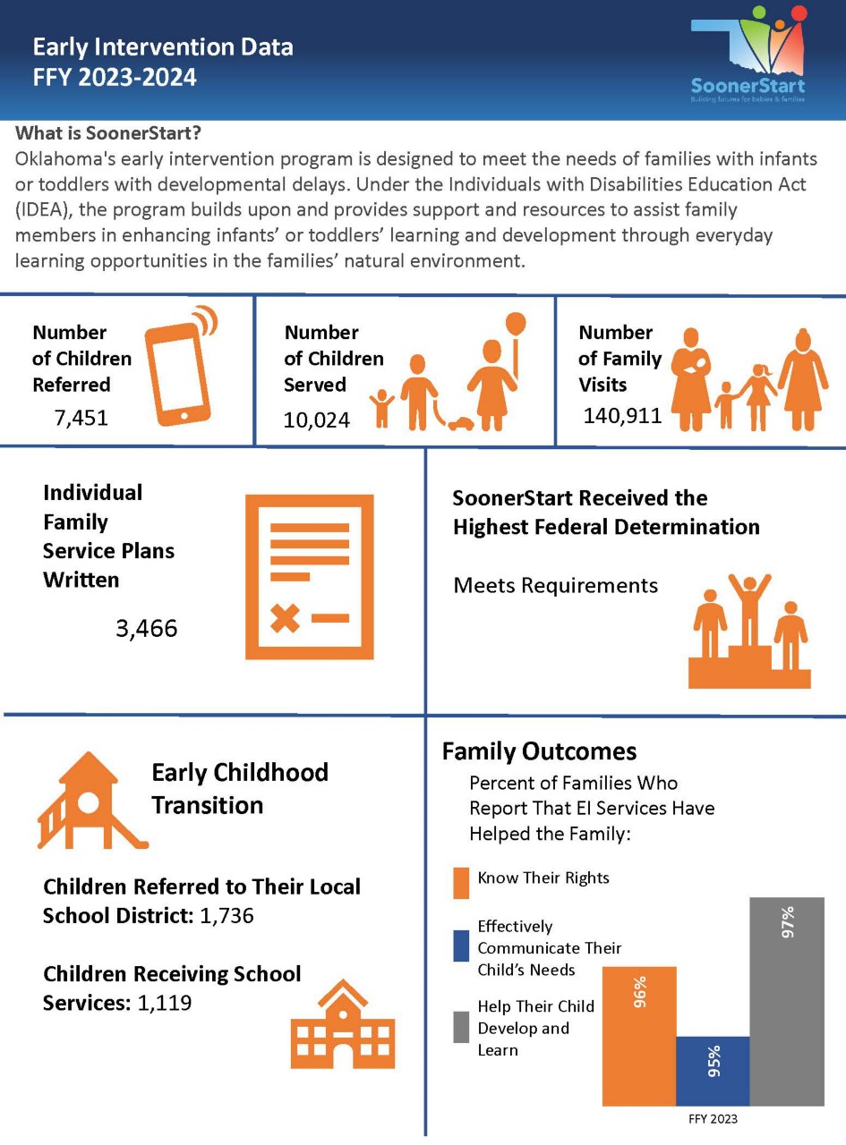SoonerStart is Oklahoma’s early intervention program designed to meet the needs of families with infants or toddlers with developmental delays. Under the Individuals with Disabilities Education Act (IDEA), the program builds upon and provides support and resources to assist family members to enhance infant's or toddler's learning and development through everyday learning opportunities.
