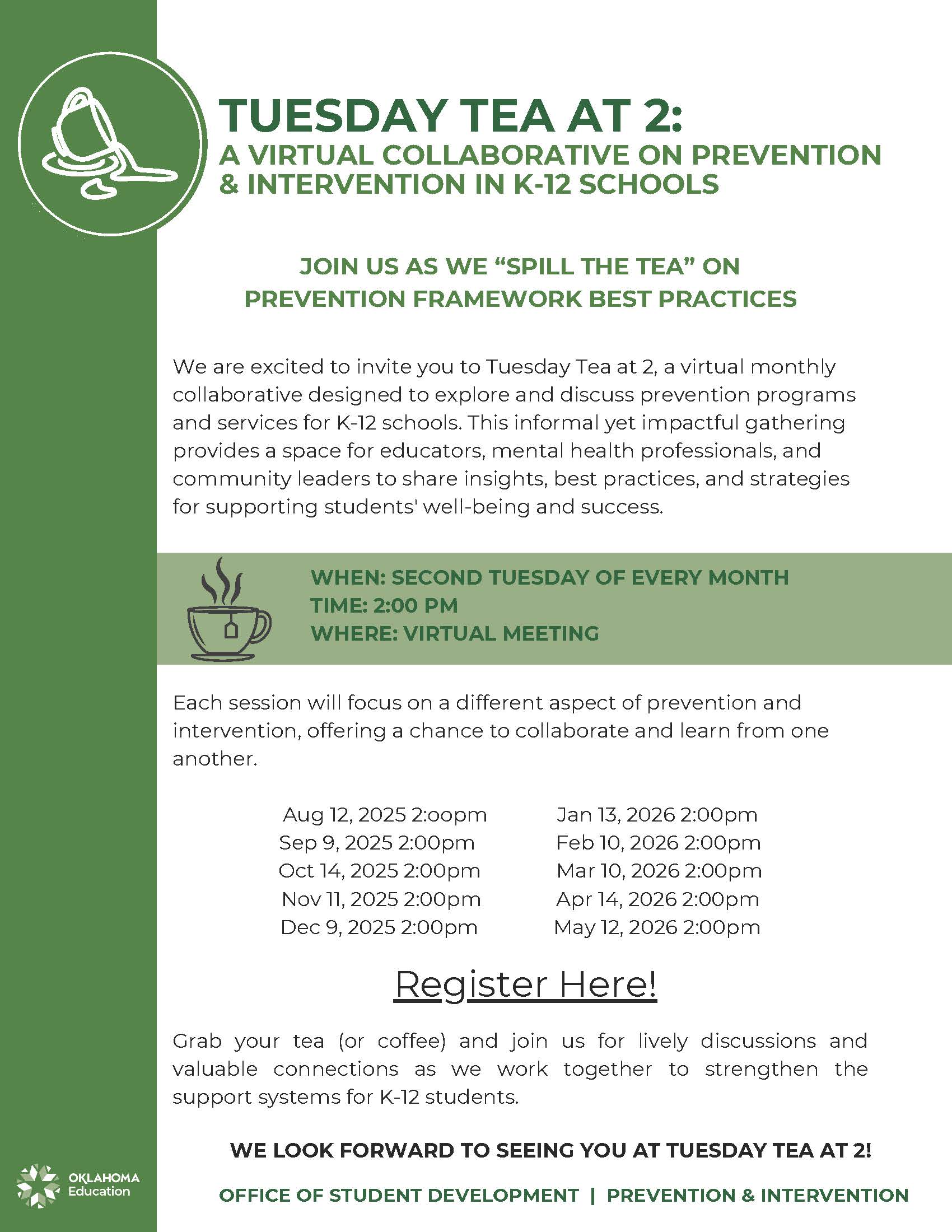 The Oklahoma State Department of Education Office of Student Support provides a holistic approach to supporting educators and families through comprehensive school counseling, academic advising, alternative education strategies, behavioral learning resources, and school-based mental health. We strive to increase access to resources that promote the academic, social, and mental well-being of all students. We resource our schools. We serve our families. We support our students.