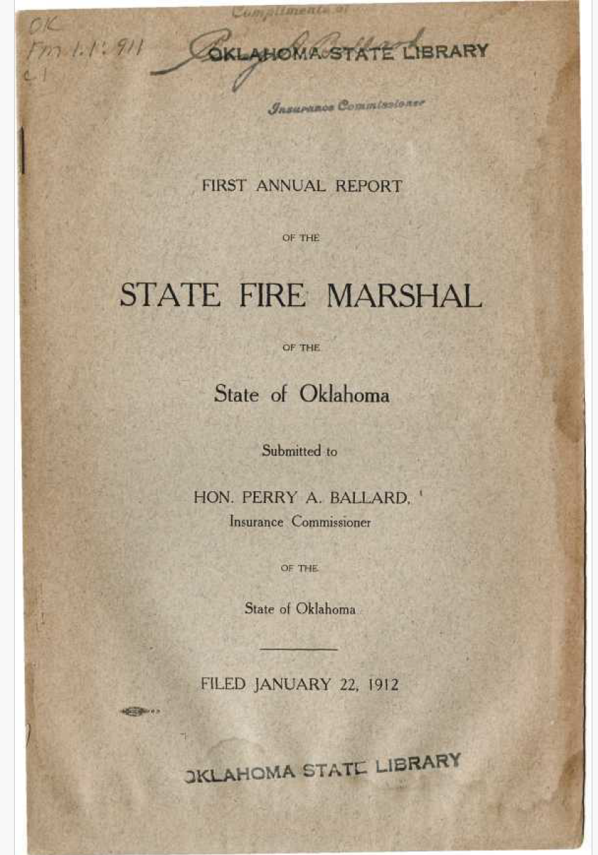 The first annual report, filed on January 22, 1912 by State Fire Marshal C. C. Hammonds, documented 713 fires and 84 investigations between June and December 1911.
