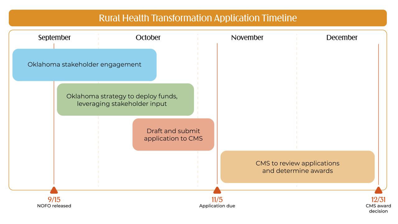 Status Update (11.7.25) - Oklahoma has officially submitted its application for RHT Program funding to the Centers for Medicare & Medicaid Services (CMS). A decision regarding approved projects and award amounts is anticipated to be announced by December 31, 2025. This webpage will be updated as implementation details for the program in Oklahoma become available.