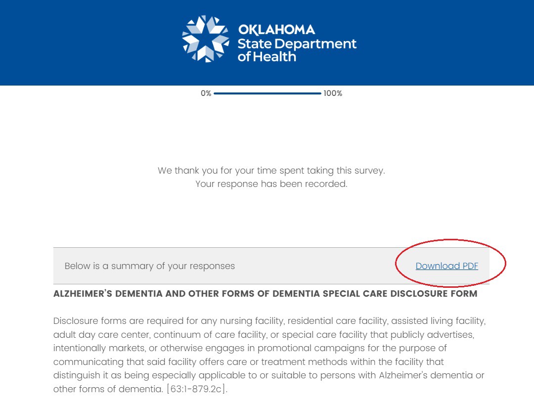 Before a long term care facility may offer care or treatment as a special care provider, each provider shall file a standardized disclosure form with the Department. The law and rule provide for the disclosure of information on special care provided to persons with Alzheimer’s disease and related disorders at facilities, homes and centers licensed by the Oklahoma State Department of Health. The rule is authorized under the Alzheimer’s Disease Special Care Disclosure Act linked below. (63 O.S. Supp. 1998, Section 1-879.2a et seq.)