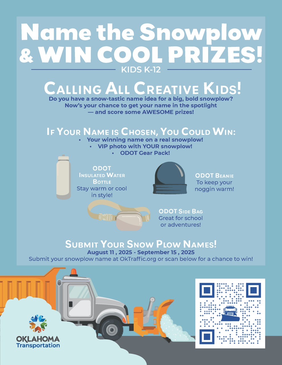 At Monday’s monthly Oklahoma Transportation Commission meeting, commissioners were given a sneak-peek at ODOT’s first-ever Snowplow Naming Contest that begins Aug. 11 and invites Kindergarten through 12th grade students statewide to name 24 snowplows in the agency’s winter fleet. Students can win prize packages and the winning names will appear on the snowplows. More information will be available at OkTraffic.org on Aug. 11.