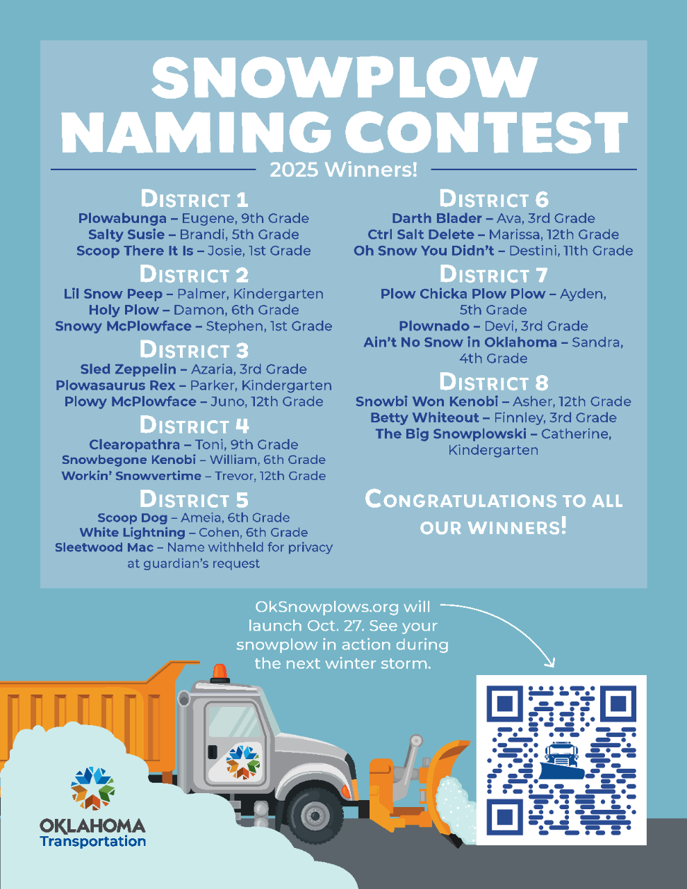 After nearly 400 creative name submissions and more than 2,100 votes cast statewide, the Oklahoma Department of Transportation is proud to announce the winners of its Snowplow Naming Contest.