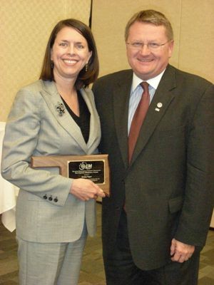 OEM Director Albert Ashwood presents this year's Ben Frizzell Award to Oklahoma City Public Information Director Kristy Yager. The award recognizes outstanding service in the area of emergency management public information.