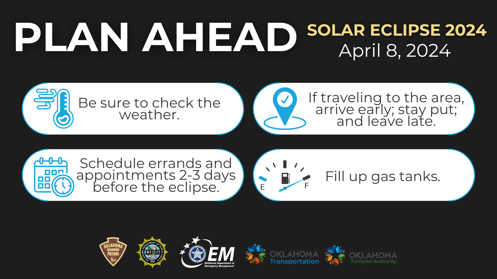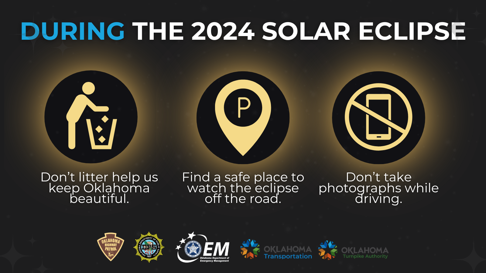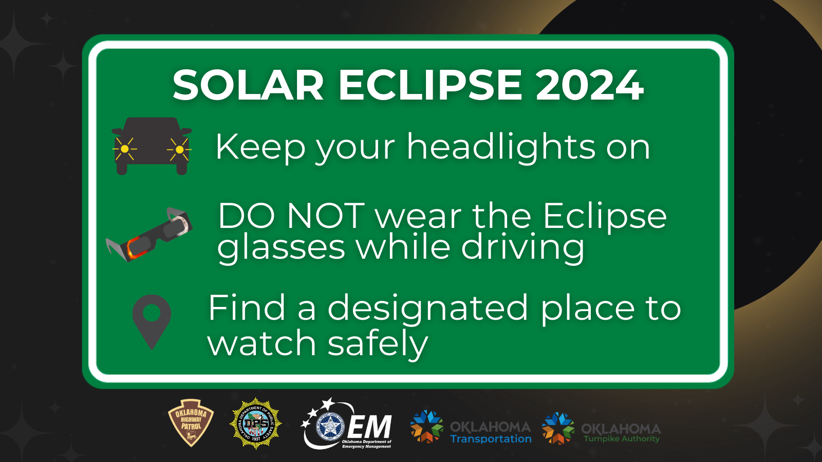 A cosmic event isn’t worth your life, or theirs. Plan ahead and drive safely. #Eclipse24 #OKlipse2024