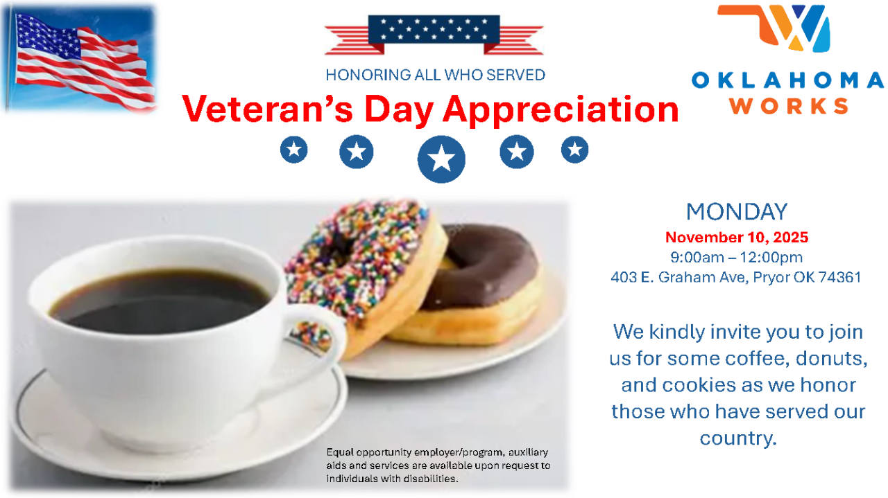 Veterans please join us at the Pryor Oklahoma Works office to celebrate those who have served our country.