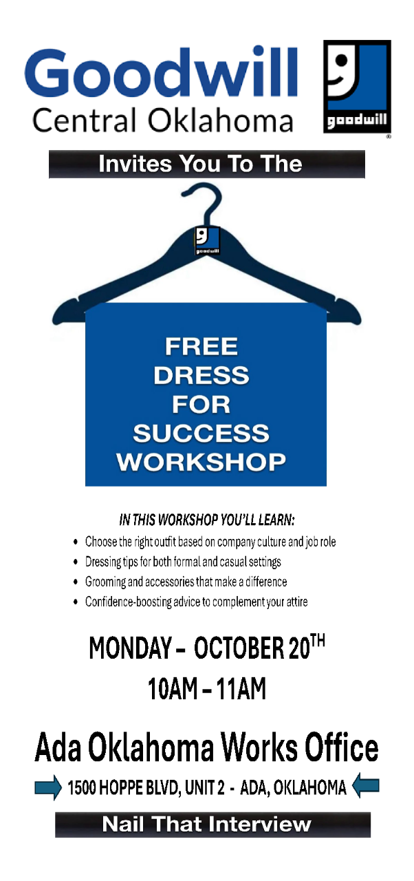 Join Goodwill for a Dress for Success Workshop and gain valuable tips on how to make a great impression and excel in your next interview.