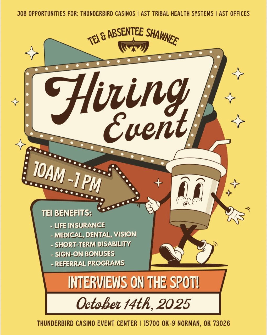 Thunderbird Casino, AST Tribal Health Systems and AST Offices are looking to hire talented individuals to join their teams. Come prepared to interview with copies of your resume in hand.