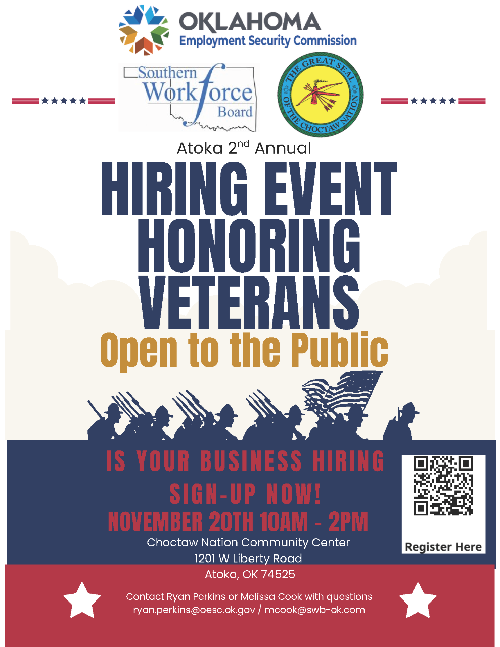 OESC, Southern Workforce Board, and Choctaw Nation have partnered for the 2nd Annual Atoka Hiring Event Honoring Veterans! While the event honors veterans during November, it is open to the general public.