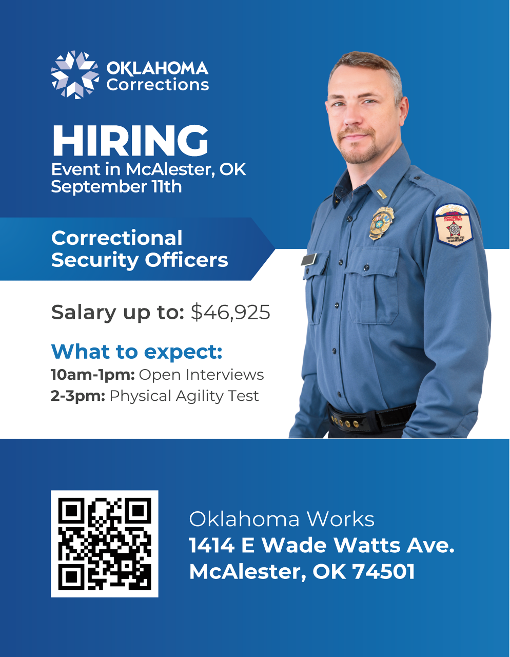The Oklahoma Department of Corrections is hiring Correctional Security Officers. Come prepared to interview with copies of your resume.