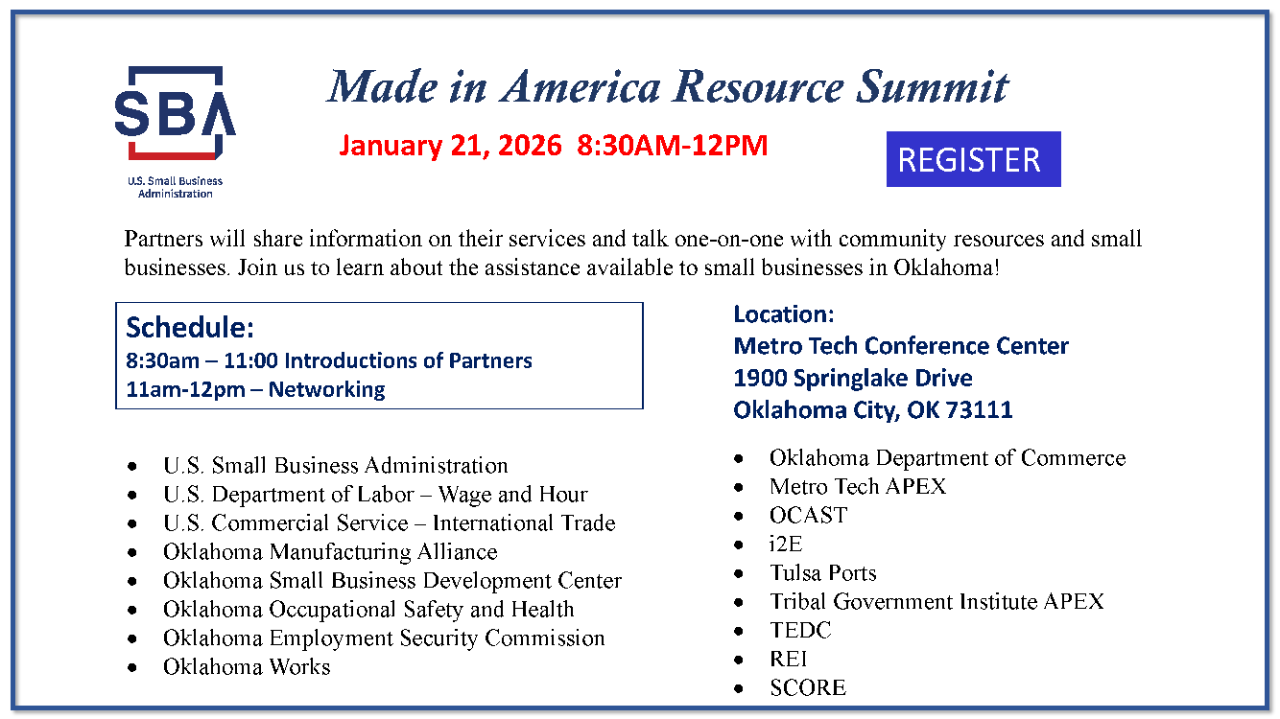 Many SBA statewide partners will share how they serve small businesses in Oklahoma with the focus on manufacturing, workforce, and trade. SBA Oklahoma District Office is teaming with Federal, State, and many other partners to provide a one-stop shop for community partners and small businesses to learn more about what these organizations can provide.
