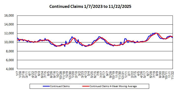 For the file week ending November 22, the unadjusted number of continued claims totaled 11,063, a decrease of 145 from the previous week’s level of 11,208. For the same file week, the less volatile continued claims 4-week moving average was 11,287, a decrease of 70 from the previous week's average of 11,357.