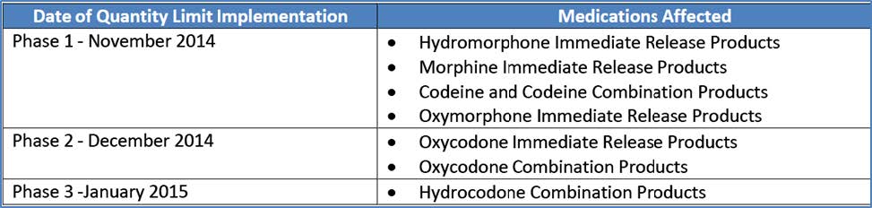 These new quantity limits will soon apply to all short-acting painkillers, regardless of the strength or drug. In efforts to allow proper notification and planning, SoonerCare is rolling out these changes over a three-phase timeline. The quantity limits on the most utilized short-acting painkiller (hydrocodone) will take place in January 2015.