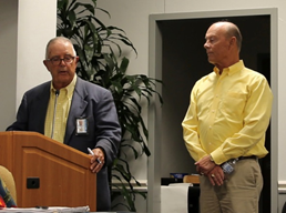 CUTLINE: OHCA Board Chairman Stan Hupfeld (left) presents past OHCA Board Chairman Tony Armstrong with the 2019 Dr. T.J. Brickner Defender of Health Award during the agency’s June board meeting.