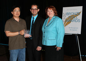 David Kim, OKDHS graphic artist (left); Ralph Cornelius, President, IABC Central Oklahoma Chapter (center); and Katherine Leidy, OKDHS Design Services programs supervisor. (photo by: Samuel Perry Photography)