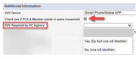 - On the Member Demographics Tab the HC Agency should check the box next to the question of “Check yes if PCA & Member reside in the same household”. If checked, an additional question will appear that must be completed by the HC Agency to designate the status of EVV requirement. The HC Agency should select Yes or No appropriately.