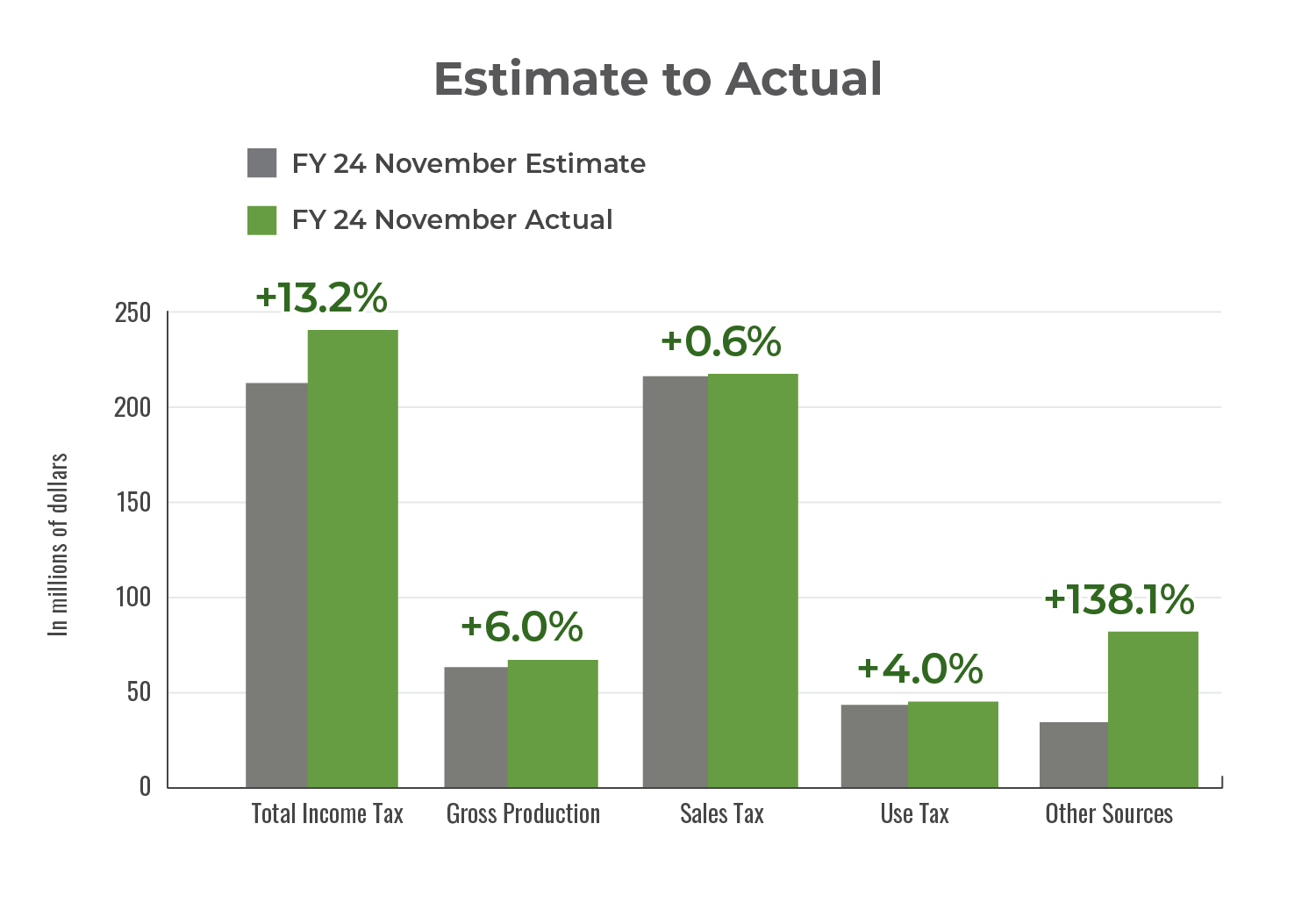“As we approach the halfway mark of the state’s fiscal year, I am happy to share that November is yet another milestone where collections outperformed the monthly and, consequently, the year-to-date estimates," said State Chief Operating Officer and OMES Executive Director John Suter. "While overall collections are slightly behind those seen during last year’s record-setting year, these results signify Oklahoma’s resilience as its citizens continue to digest the effects of higher interest rates, mounting inflation and lower commodity prices.”