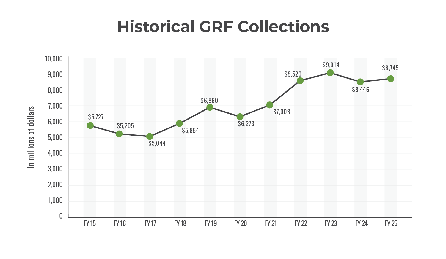 OKLAHOMA CITY – General Revenue Fund (GRF) collections for fiscal year 2025 totaled $8.7 billion, which is $224.7 million, or 2.6%, above the estimate for the year. This total is also $279.1 million, or 3.3%, above collections from FY 2024.