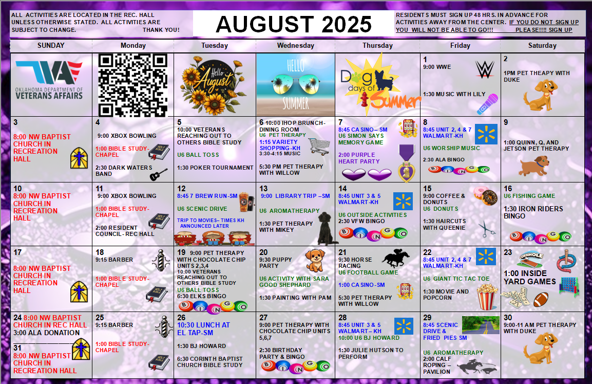 Activities include bingo, arts and crafts, pool, dominoes, field trips, fishing trips, sightseeing, visits by various singing groups, and many other activities.
