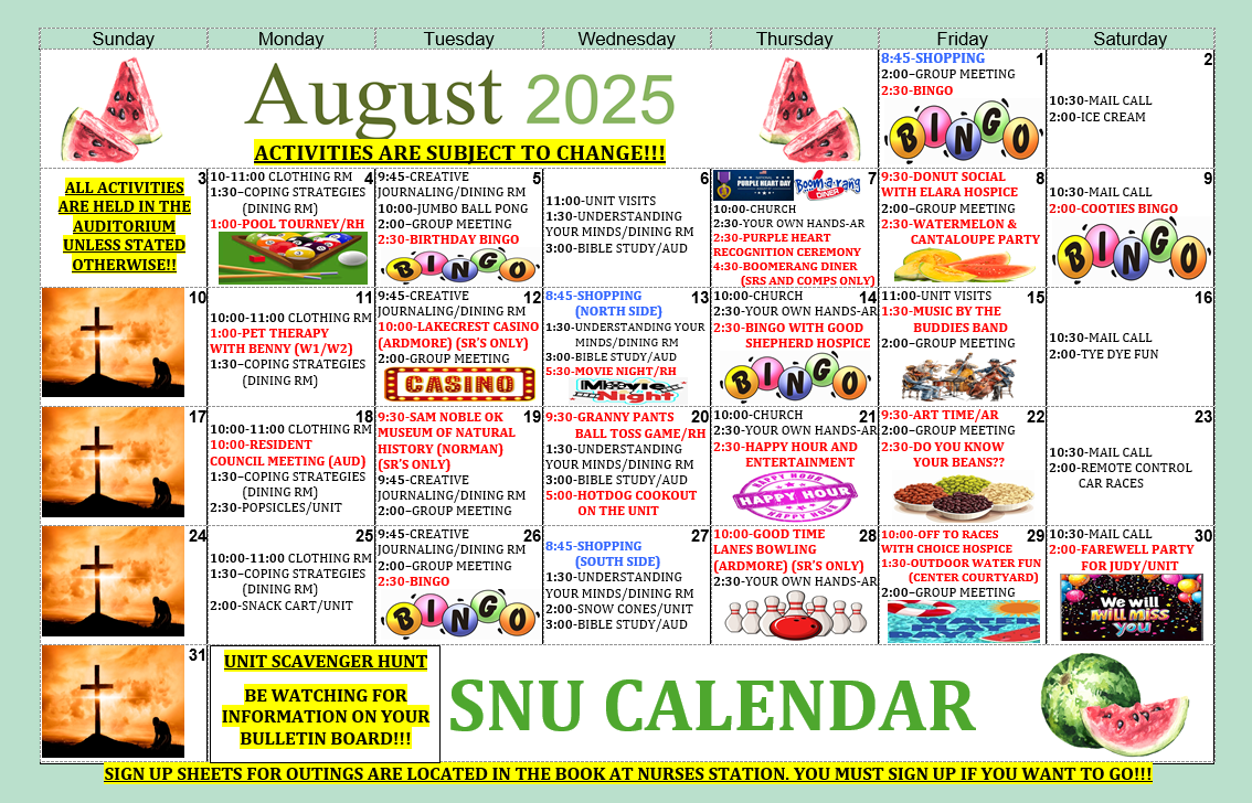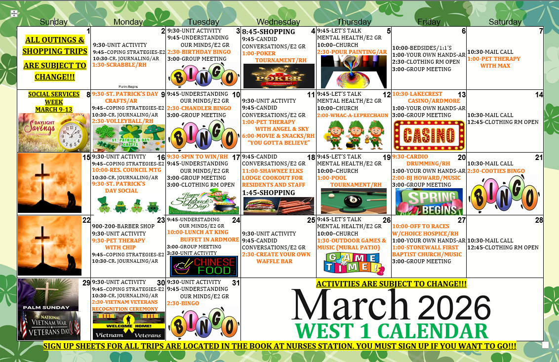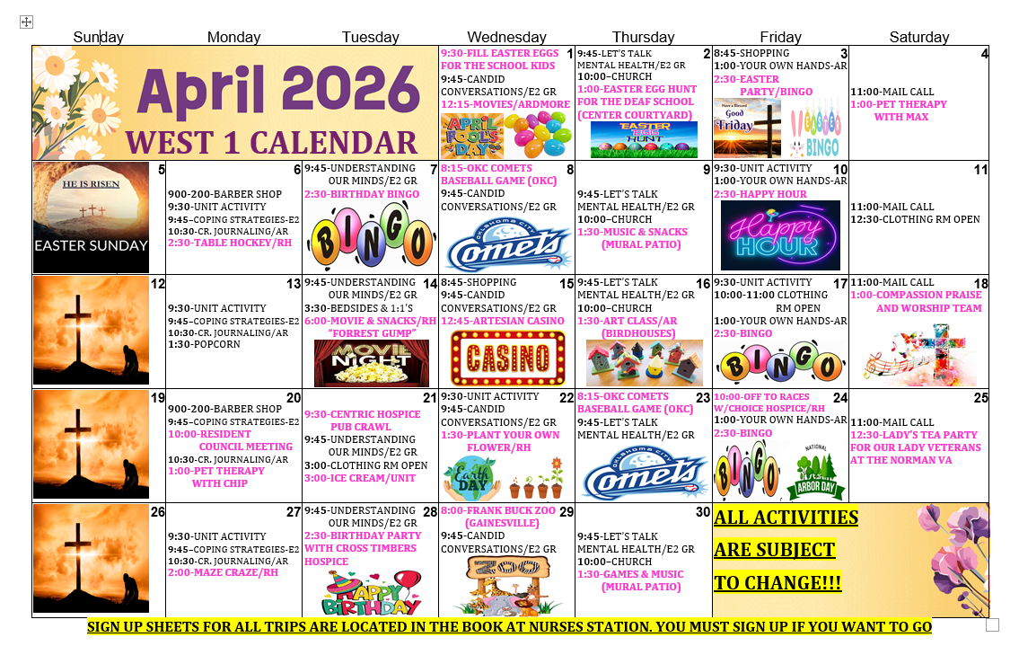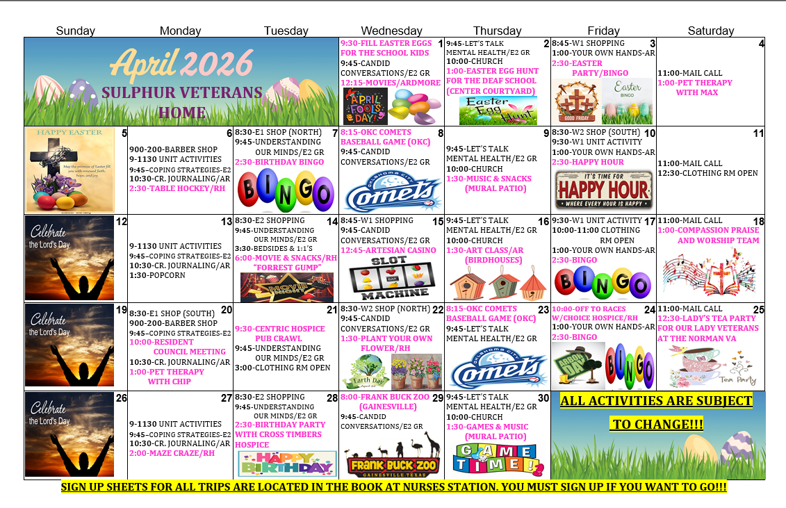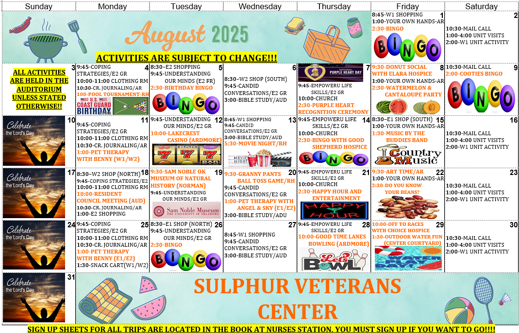 Based on the veterans’ individual needs, long-term skilled nursing and medical care are provided by a full-time medical staff, registered nurses, licensed practical nurses, certified nurse aides, licensed social workers, pharmacists, certified dietary managers as well as numerous support staff. Therapeutic recreational activities are also provided. Residents enjoy outings in the surrounding community, including fishing trips, bowling, and shopping trips.