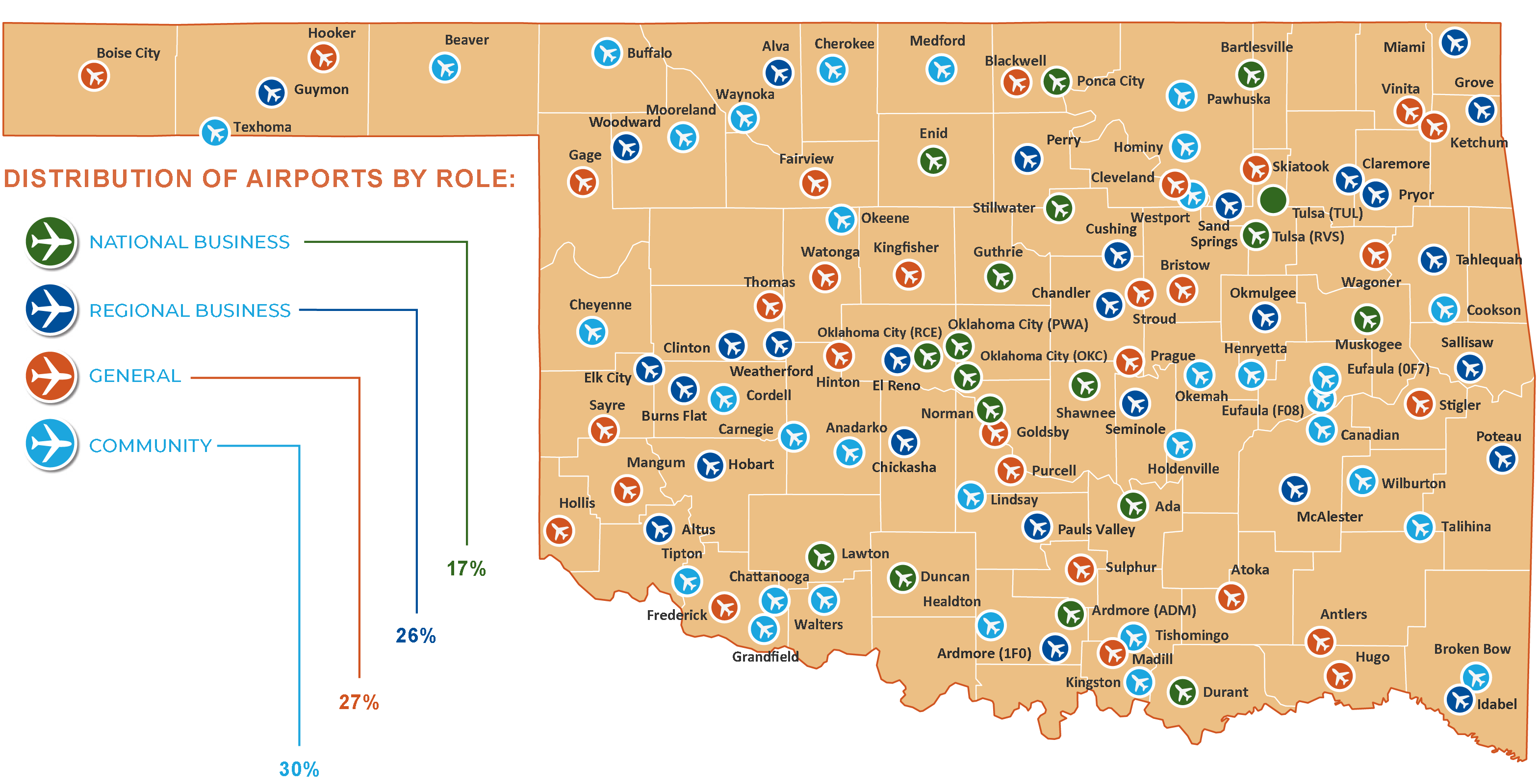 Empowered and directed to encourage, foster, and assist in the development of aviation and aerospace in the state and to encourage the establishment of airports and air navigation facilities, one of the Department’s primary duties is to support Oklahoma’s airport system comprising 108 publicly-owned airports. The Department accomplishes this by investing in the five-year airport construction program, completing routine safety and standards inspections, conducting pavement inspections, helping airports with long-term planning and strategy, and assisting airports with hosting celebrations and fly-ins