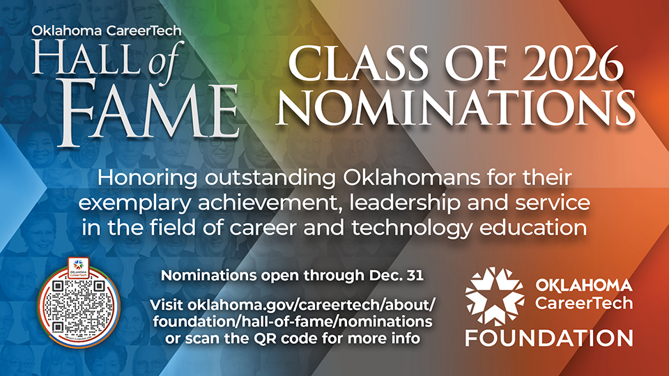 Nominations for the Oklahoma CareerTech Hall of Fame will open Aug. 1, 2025. The deadline to submit nominations is Dec. 31, 2025. The next induction banquet is tentatively scheduled for Fall of 2026.