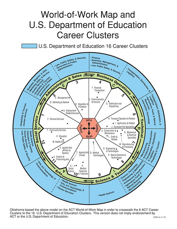 Oklahoma based this model on the ACT World of Work Map in order to crosswalk the six ACT Career Clusters to the 16 U.S. Department of Education Clusters.