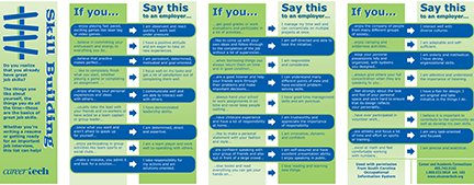 Having problems connecting student abilities, skills or interests into real world job skills that employers are looking for? The Skill Building Brochure (CS9052) will help you work with students on decoding their transferable skills helping them create great resumes and get the job they desire. (Please note, the Skill Building Brochure is only available to customers in Oklahoma.)