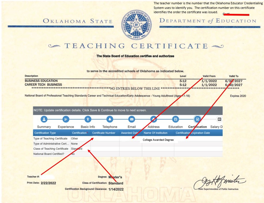 - Teaching Certificate Number (See image below)