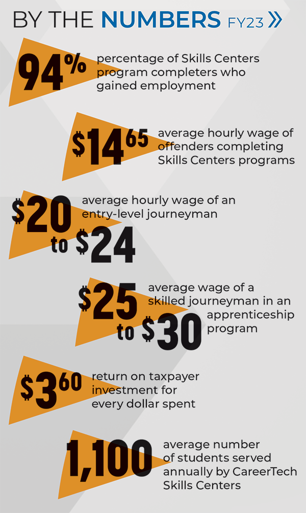The statewide CareerTech Skills Centers system serves an average of 1,100 students annually, offering full-time programs and short-term training at 16 sites housed within DOC facilities. CTSC provides oversight for the state’s secondary dropout recovery programs.
