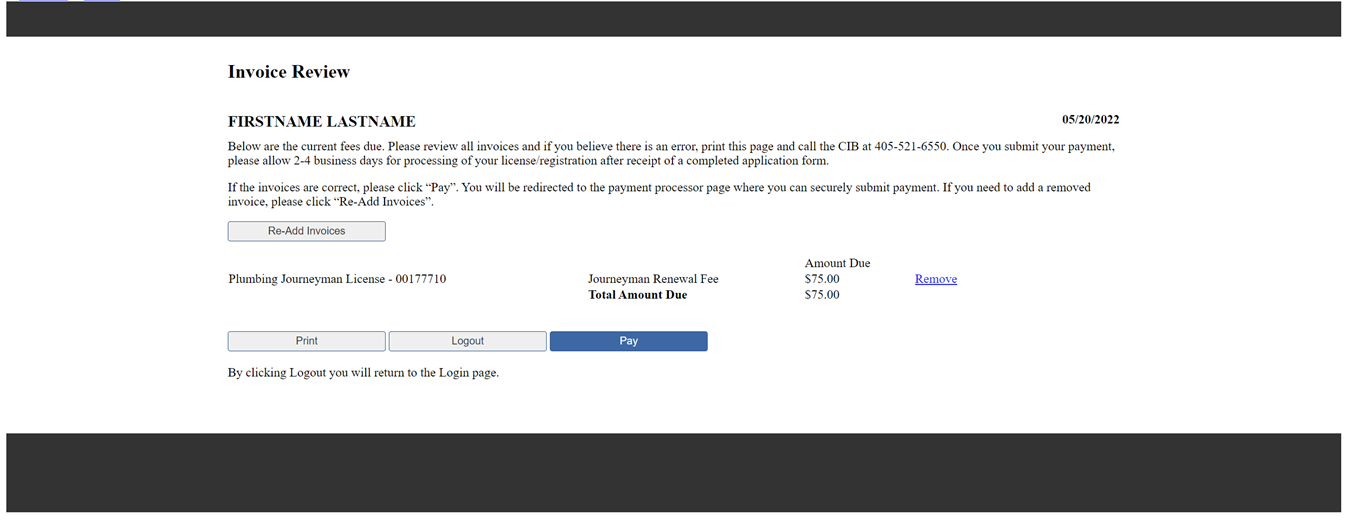 7.  Review the invoice and then click "Pay" (if you do not wish to pay an invoice click "Remove"). Please, only choose the license/registration you are currently wanting to renew and remove the others.