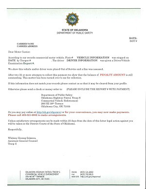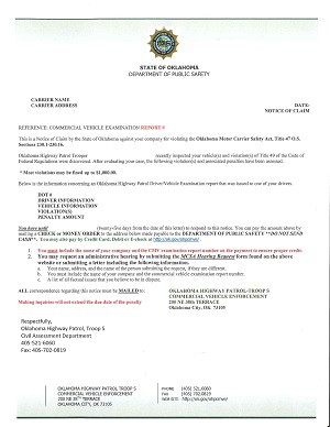 Final Notice of Claim letter A third and final letter has been sent to the driver or company to collect the civil penalty balance due. Failure to pay could result in legal action or jeopardize your operating authority in Oklahoma. |