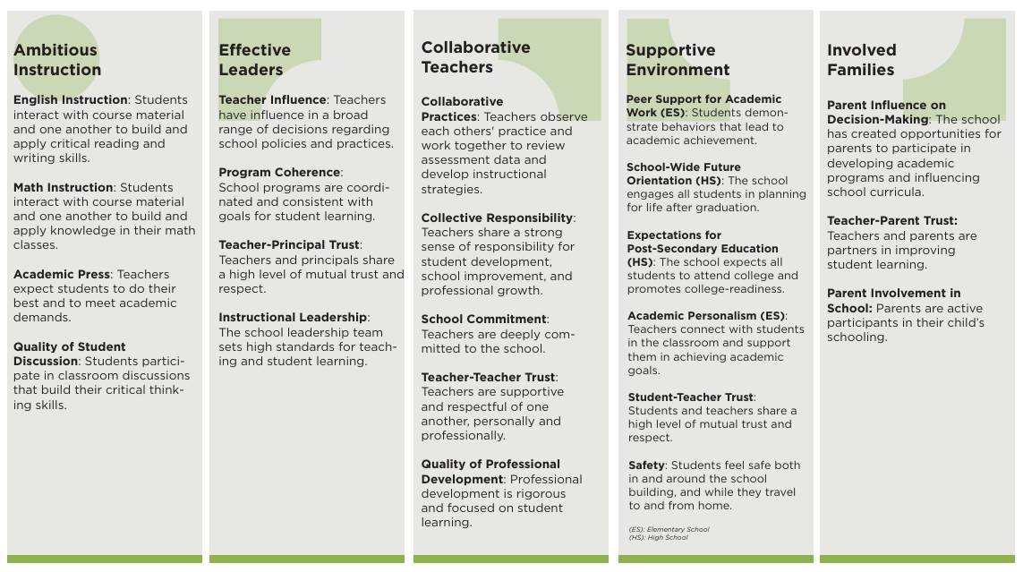 The 5Essentials Framework is based on over 20 years of research from The University of Chicago Consortium on School Research. The Framework outlines the 5Essential factors that research revealed are necessary for driving sustainable school improvement: Effective Leaders, Collaborative Teachers, Ambitious Instruction, Supportive Environment, and Involved Families.