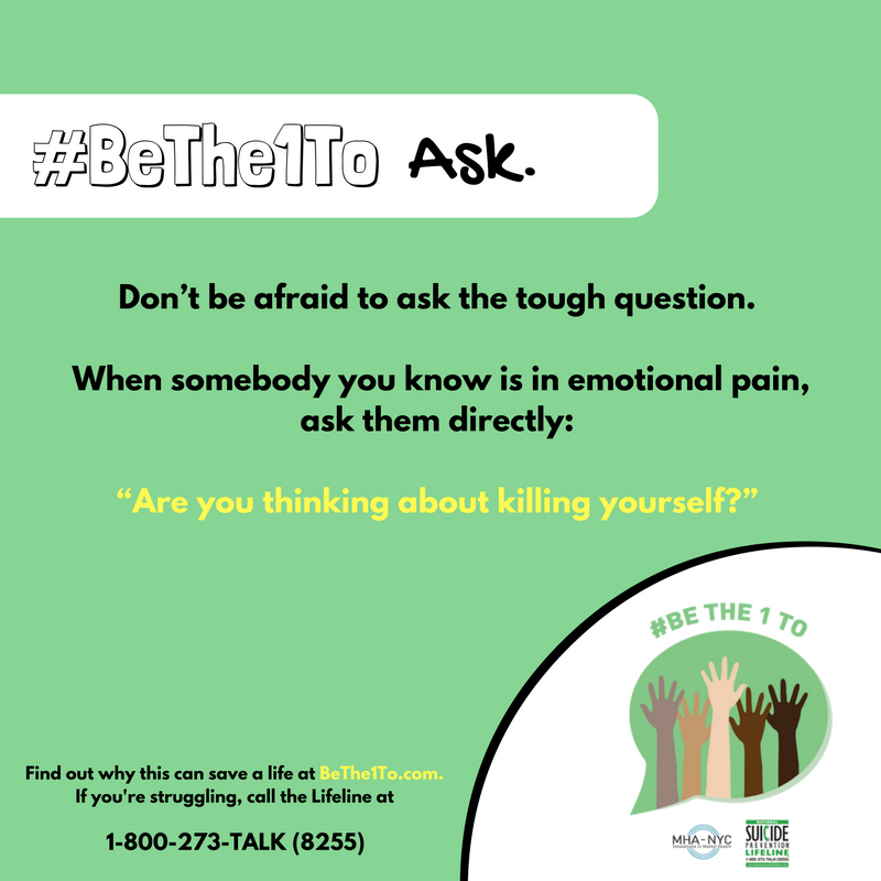 Here you can find tips for talking with youth. And resources for youth, so they can find answers or a really trusted ear to talk to. The Child and Adolescent Health department have adapted the “#BeThe1To” model for action on suicide prevention. There are 5 action steps in this model that help guide youth and advisors alike on how to open communications and to recognize the signs of a youth at risk.