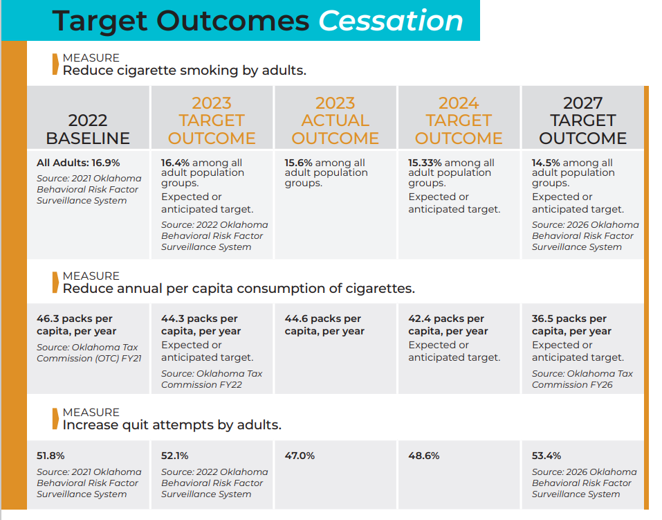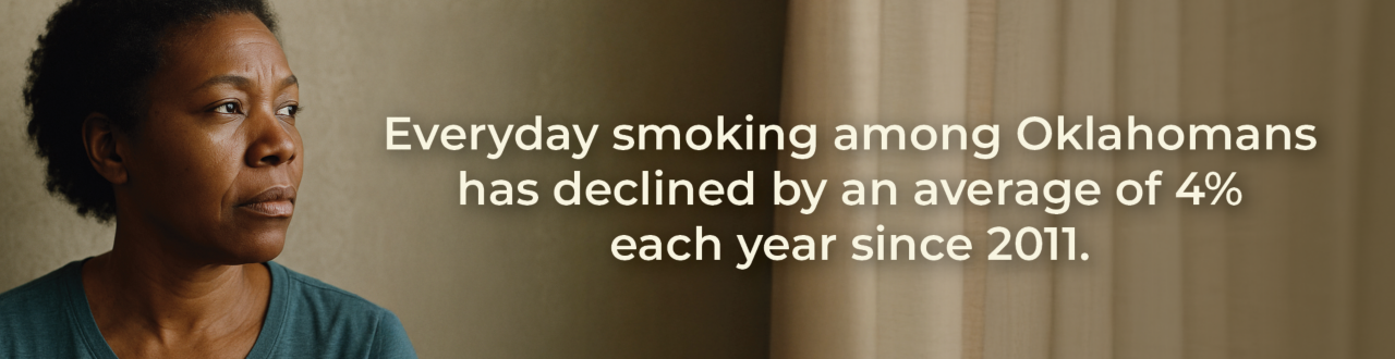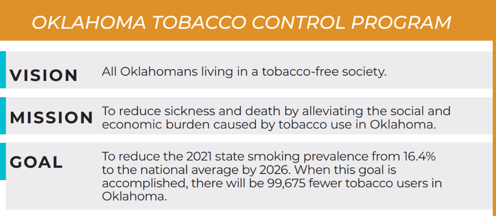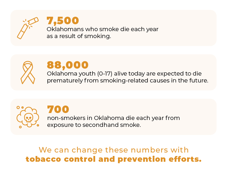 Approximately 7,500 Oklahomans die each year from tobacco-related causes, with more than 700 caused by exposure to secondhand smoke alone. The Oklahoma State Department of Health's Chronic Disease and Prevention Services works to prevent tobacco initiation and reduce existing tobacco use through systems-level and social norm change. Tobacco control efforts in Oklahoma work in partnership among many organizations and agencies to ensure adherence to the best practice strategies that have been proven to work.
