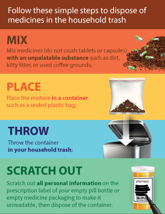 If there isn't a drop box available in your area, you can follow these simple steps to dispose of most medications in the household trash: