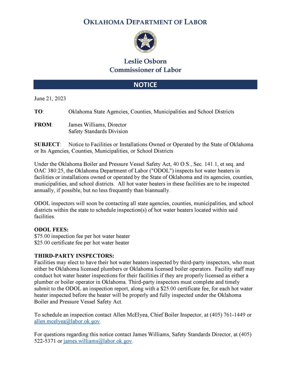Notice to Facilities or Installations Owned or Operated by the State of Oklahoma or Its Agencies, Counties, Municipalities, or School Districts