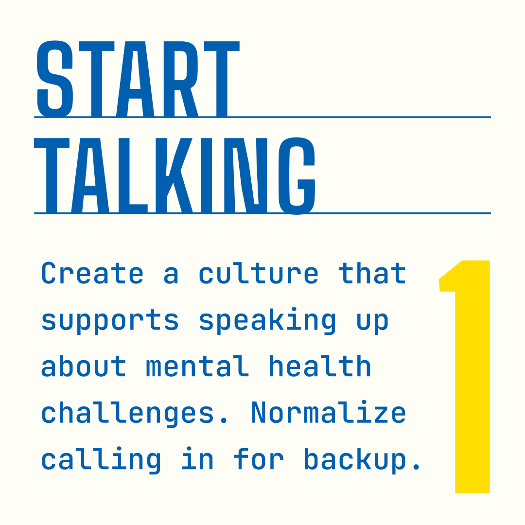 Start talking. Create a culture that supports speaking up about mental health challenges. Normalize calling in for backup.