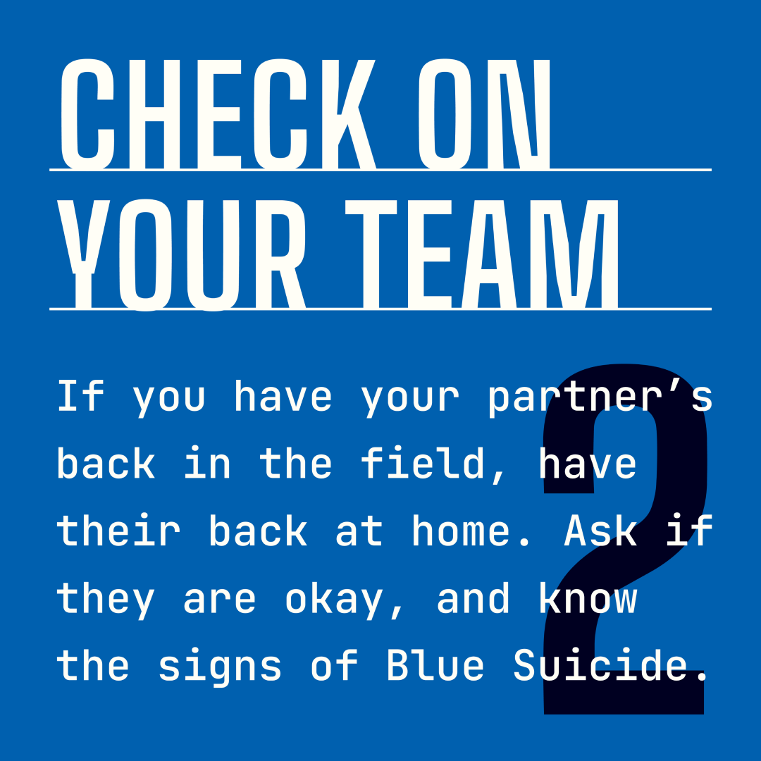 Check on your team. If you have your partner’s back in the field, have their back at home. Ask if they are okay, and know the signs of Blue Suicide.