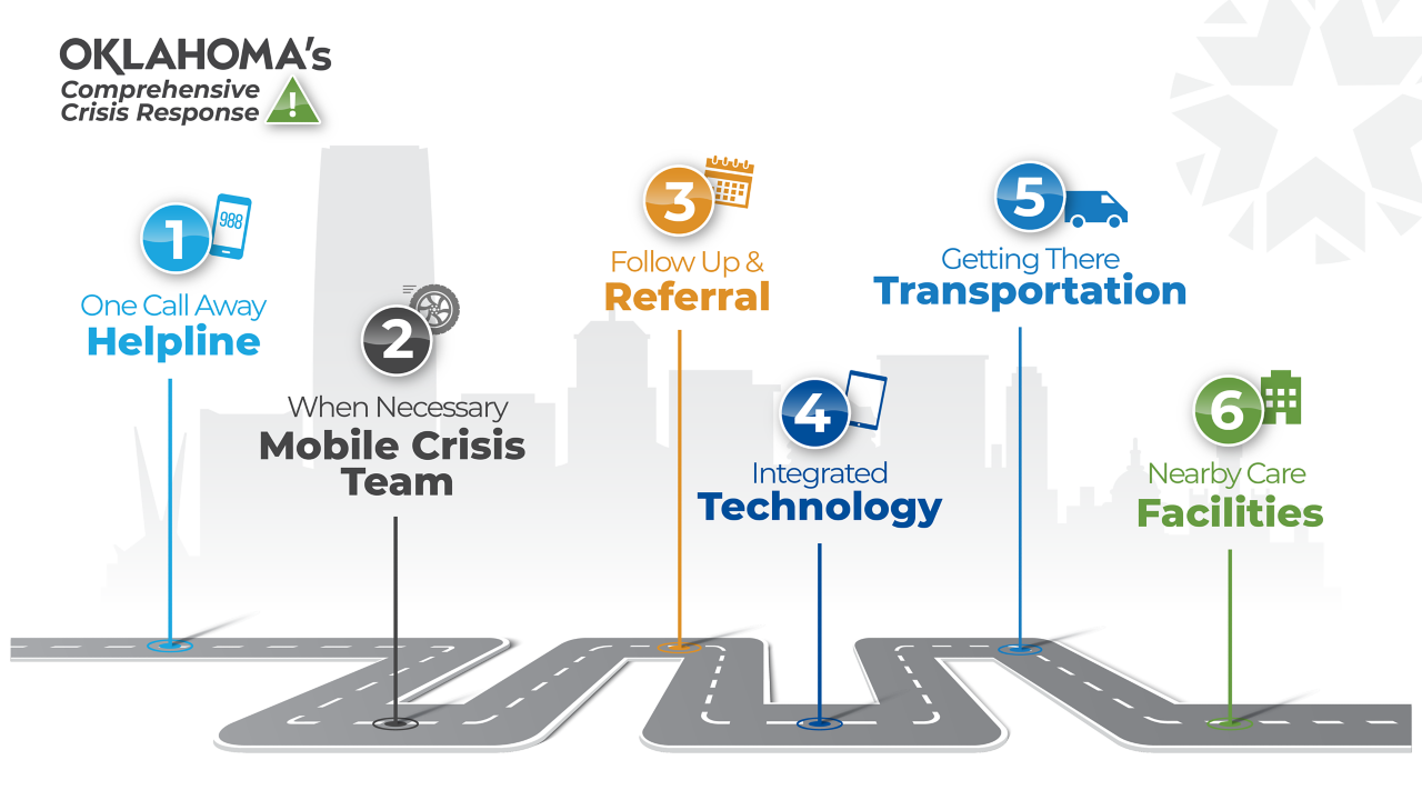 Oklahoma's Comprehensive Crisis Response system expands beyond the national 988 lifeline with systems specifically designed to work within the state's mental health infrastructure. As of January 2023, ODMHSAS has implemented the following to better serve Oklahomans: