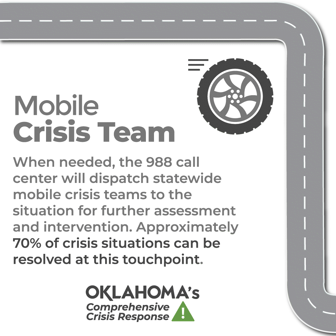 On average, around 90% of calls to the 988 Mental Health Lifeline are resolved over the phone. Oklahomans that need more help after their initial call may be connected with a Mobile Crisis Team in their area.